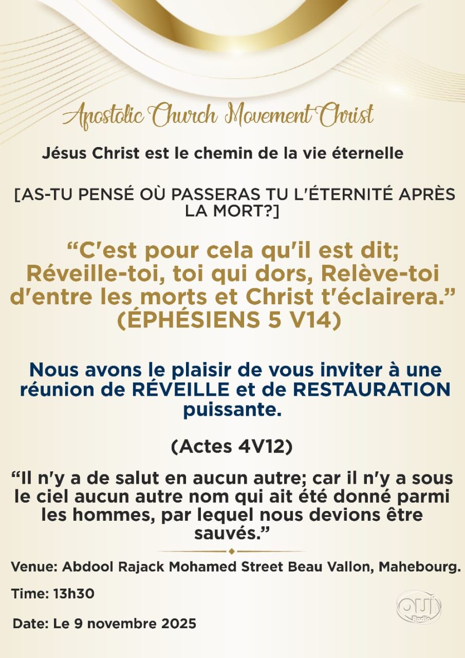Jésus Christ est le chemin de la vie éternelle. L’Apostolic Church Movement Christ est heureuse de vous inviter à une réunion de RÉVEIL et de RESTAURATION puissante.