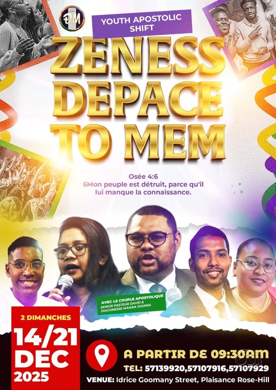 Le Youth Apostolic Shift vous invite à “ZENESS DEPACE TO MEM” (Jeunesse, Déplace-toi Toi-même), un puissant rassemblement sur deux dimanches consécutifs : le 14 et le 21 Décembre 2025.